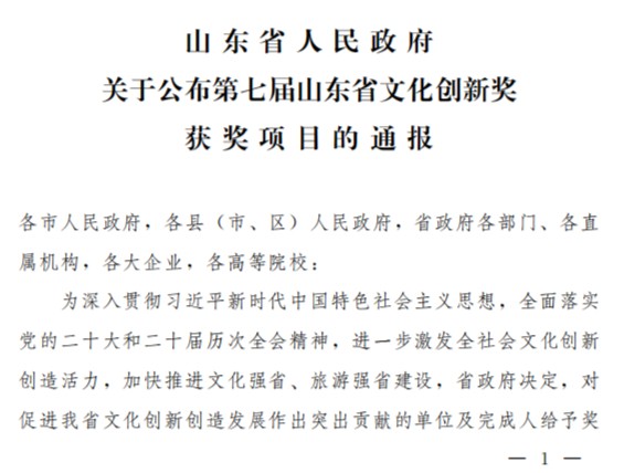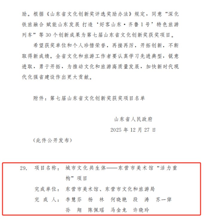 近日,山东省人民政府公布第七届山东省文化创新奖获奖项目名单,“城市文化共生体”——东营市美术馆“活力重构”项目成功入选。该奖项是省政府设立的省级文化创新最高奖项,是省功勋荣誉表彰工作领导小组办公室公布的2025年省级评比表彰项目之一。