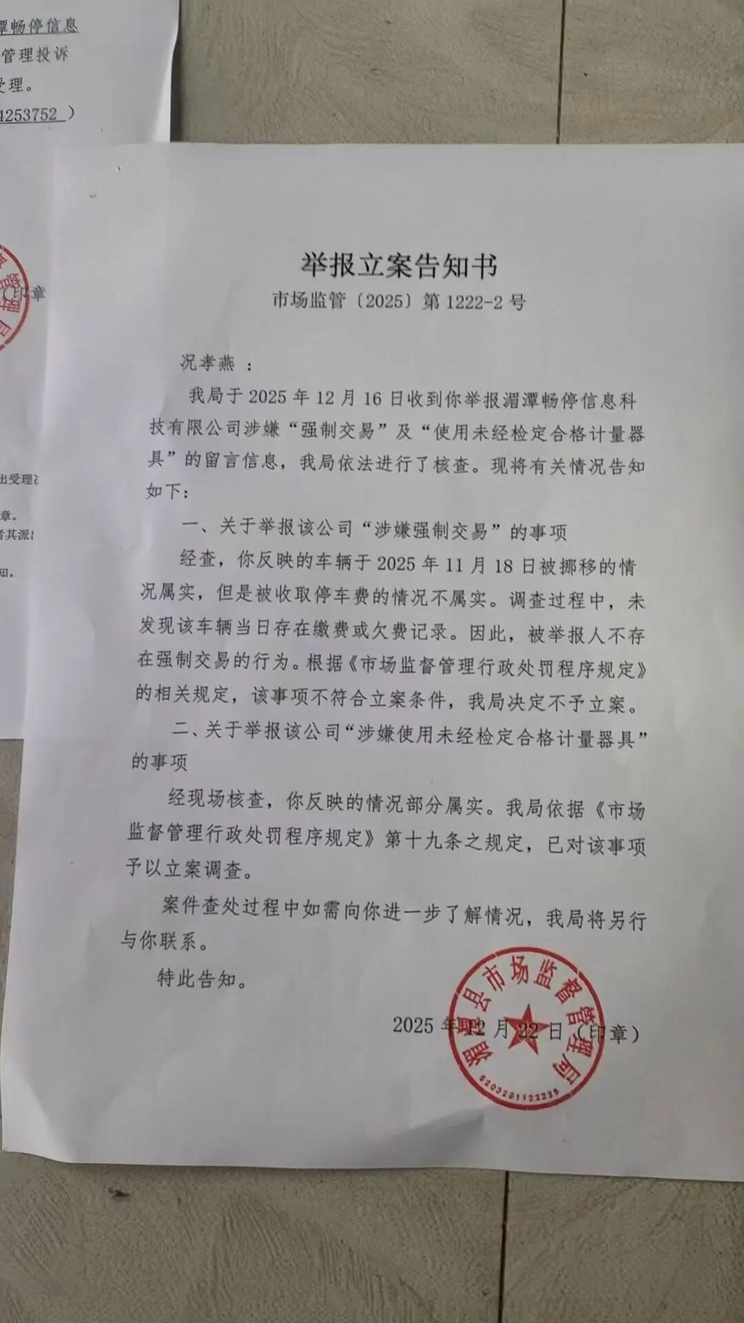 况女士又向当地市场监督管理局投诉,举报该公司存在强制交易行为,且涉嫌使用未经检定合格的计量器具。该局书面答复称,经查,你反映的车辆于2025年11月18日被挪动的情况属实,但被收取停车费的情况不属实,调查中未发现该车辆当日有缴费或欠费记录;关于“涉嫌使用未经检定合格计量器具”,经现场核查,你反映的情况部分属实。依据《市场监督管理行政处罚程序规定》第十九条,我局已对该事项立案调查。