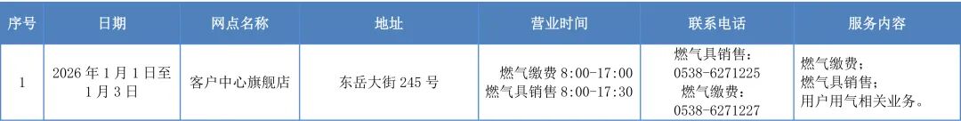 假期间,根据国家法定节假日及公司工作安排,泰山燃气集团所属泰山港华公司客户服务中心营业时间具体如下: