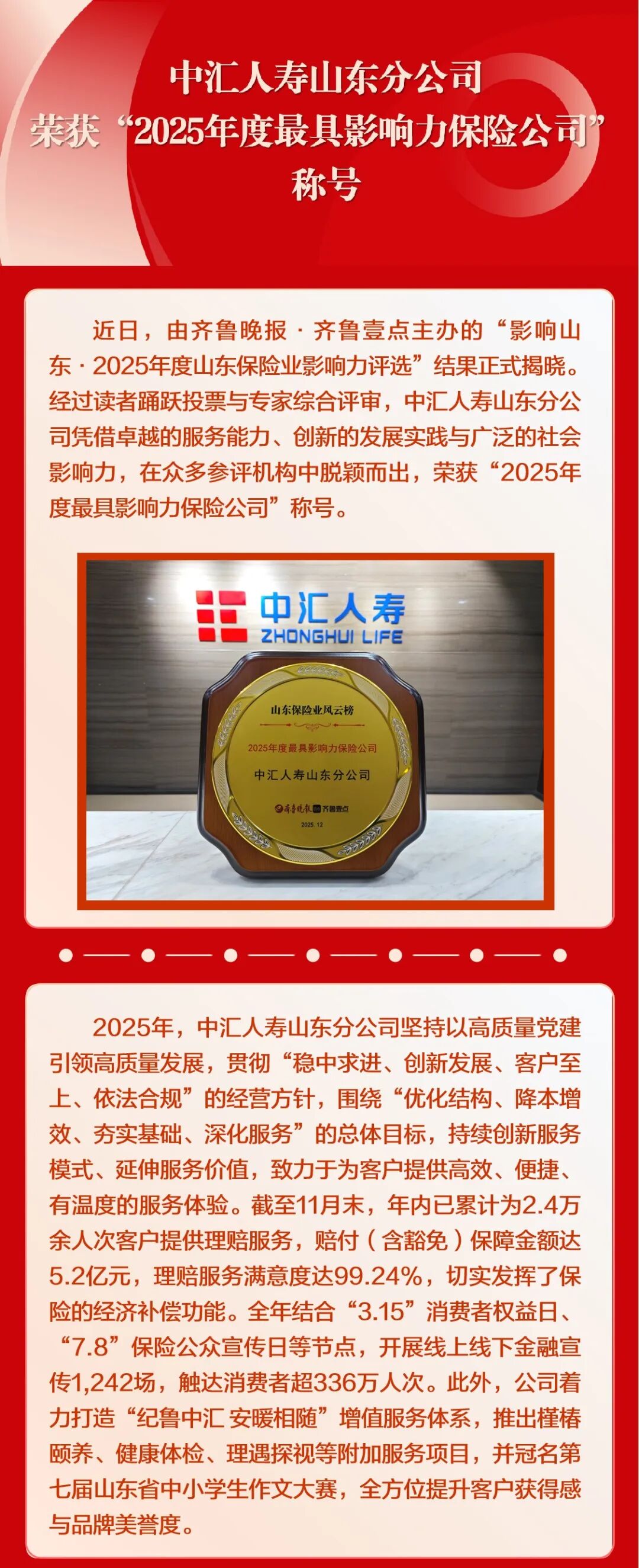 品牌荣誉丨中汇人寿山东分公司荣获“2025年度最具影响力保险公司”称号