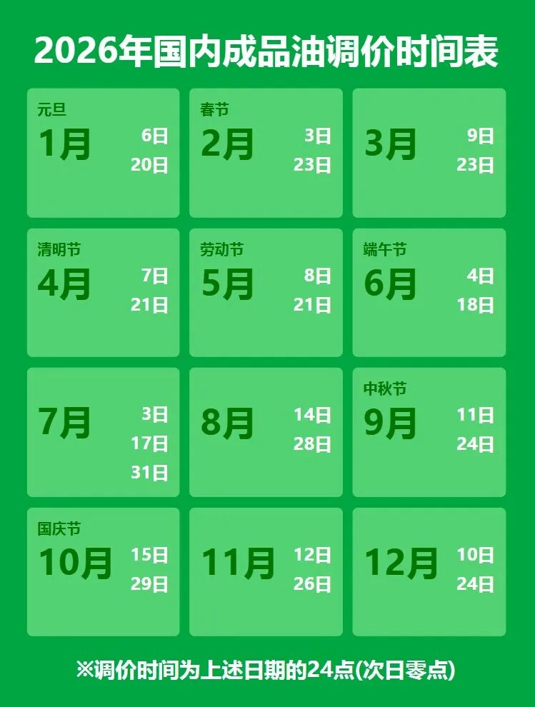 2026年首次油价调整时间为1月6日24时(下周二24时)