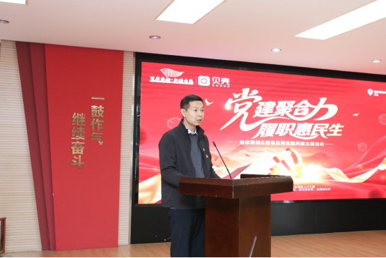 冬意渐浓,温情更暖。近日,以“党建聚合力,履职惠民生”为主题的党建共建活动在青岛市北区台东街道成功举行。本次活动由台东街道党工委与贝壳找房青岛科技有限公司(以下简称“青岛贝壳”)党支部联合主办,旨在通过政、社、企三方联动,探索基层社会治理新路径,通过“三件实事”将人大代表企业的社会责任切实转化为惠及民生的温暖行动。台东街道党工委书记潘家斋、办事处人大工作委员会主任杨国江、青岛贝壳城市总经理赵阳、青岛链家总经理任佰京等出席活动。