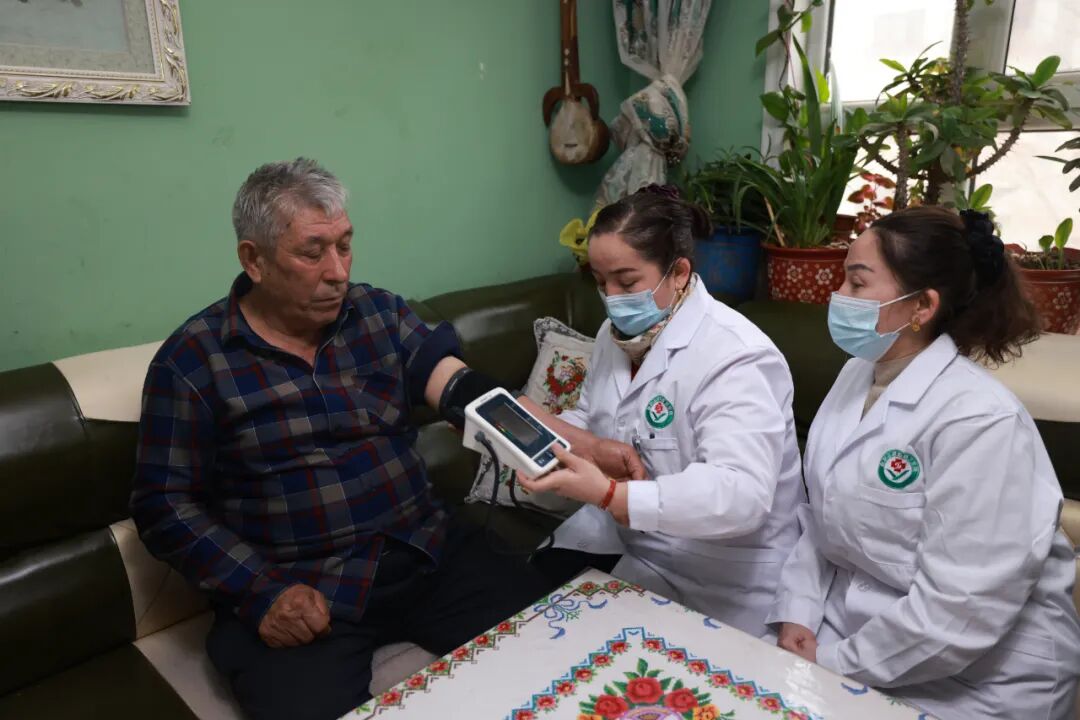医护人员为老人量血压。喀什地区融媒体中心 记者陈文军 摄