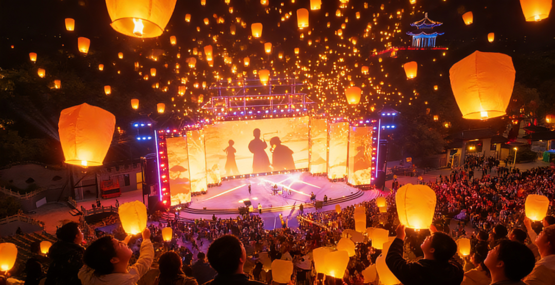 活动详情:万人电子孔明灯同步升空,人气摇滚乐队倾情献艺,更有“狐仙”NPC互动。