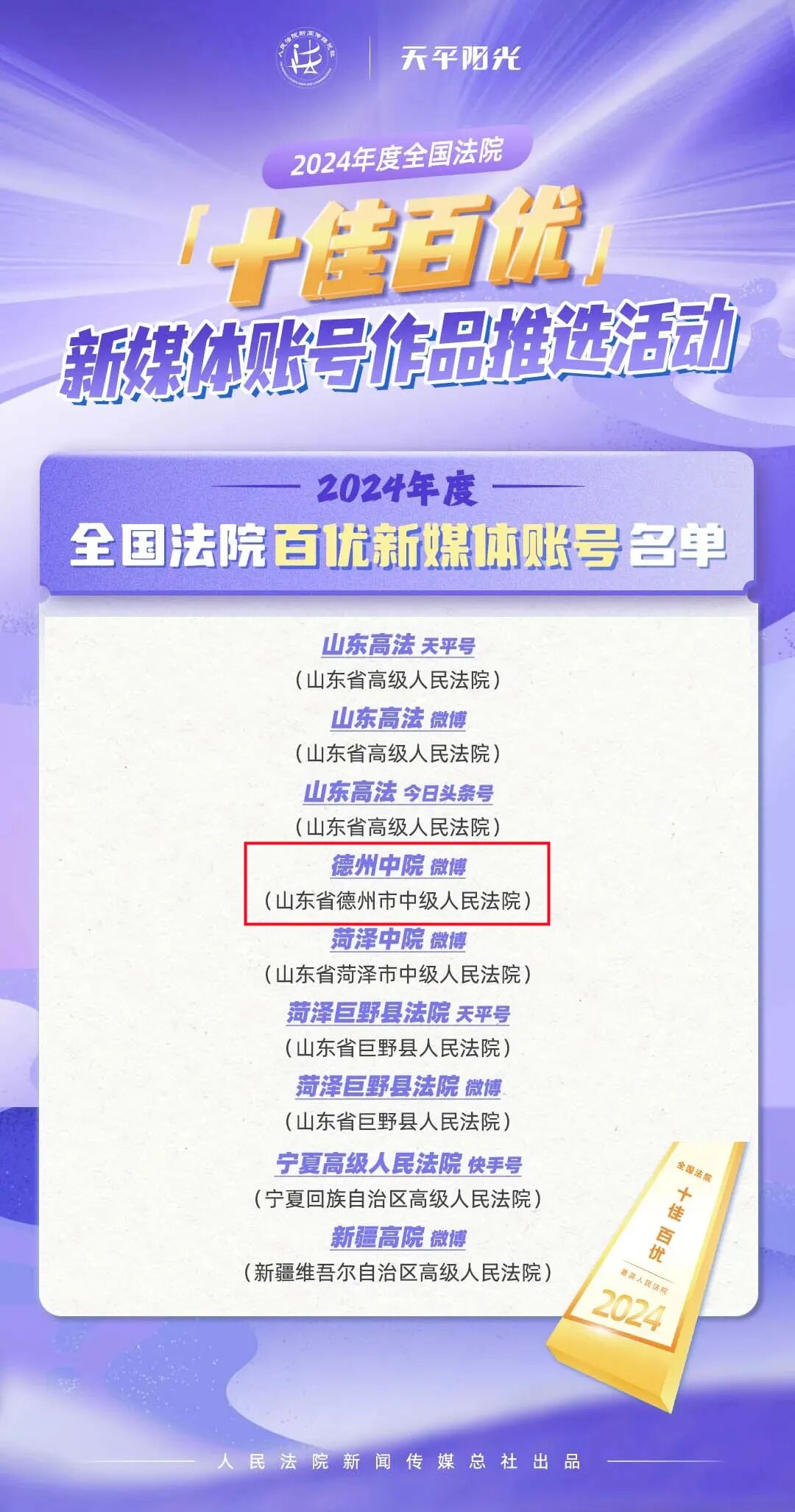 近日,德州市中级人民法院官方微博再创佳绩,捷报双至:在2024年度全国法院“十佳百优”新媒体账号作品推选活动中,德州中院官方微博荣获2024年度全国法院百优新媒体账号;在全省法院第三届优秀新媒体推选活动中,德州中院官方微博荣获全省法院第三届十佳微博账号。