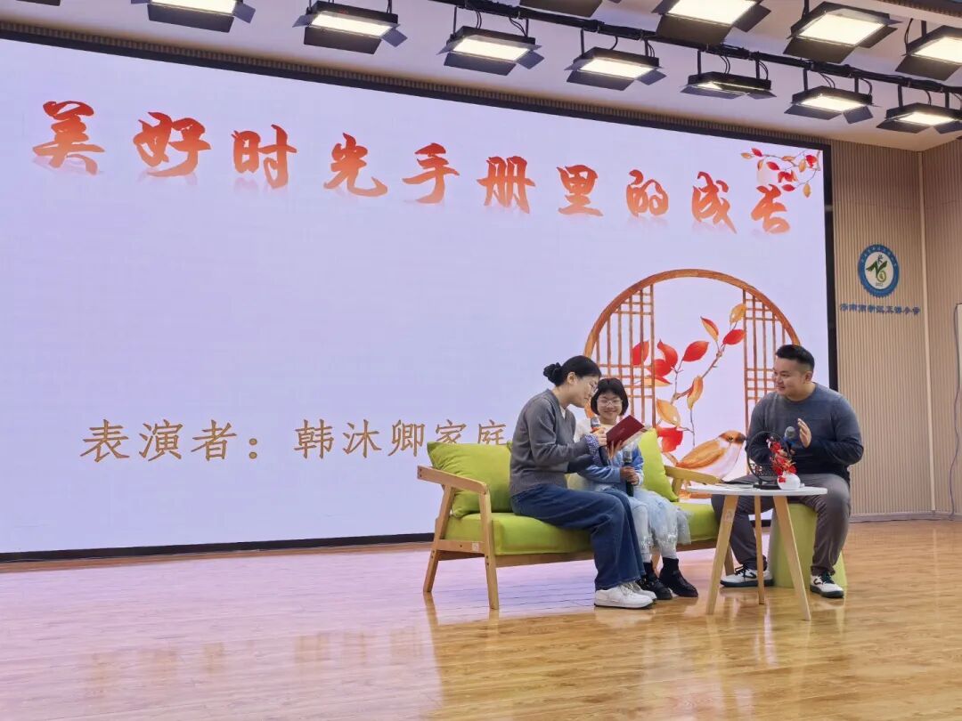 成果演绎环节分三大篇章层层递进,充分展现学科融合特色与家校同心育人氛围。二、三年级学生代表以“诵读+小课题研究”的形式分享阅读心得;四年级学生带来数学与美术跨学科融合展示,在“锦灰堆”的残纸叠影中解读“三万里河”的壮阔意象;一年级学生演绎三句半《陆游趣谈》,以诙谐语言解锁诗词逸闻;二至五年级学生携手呈现《辛弃疾的诗词与人生》学科融合展示,深度解读爱国词人的精神世界,诠释“铁血丹心照家国”的内核。此外,学生韩沐卿及家长带来的亲子情景剧《美好时光手册里的成长》,生动演绎了家庭共读的温馨场景,让《家校美好时光手册》成为家校沟通的暖心桥梁。