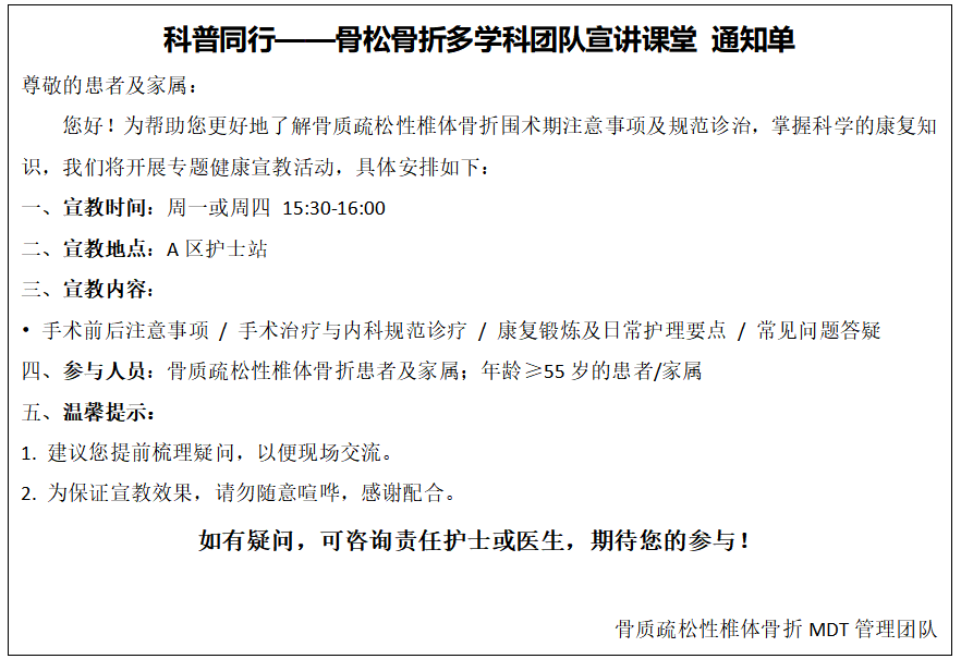 未来,骨质疏松性椎体骨折 MDT 管理团队将继续优化宣讲流程,根据患者需求不断丰富内容、创新形式,提升健康宣教的精准性与实用性,为更多患者的骨骼健康保驾护航。