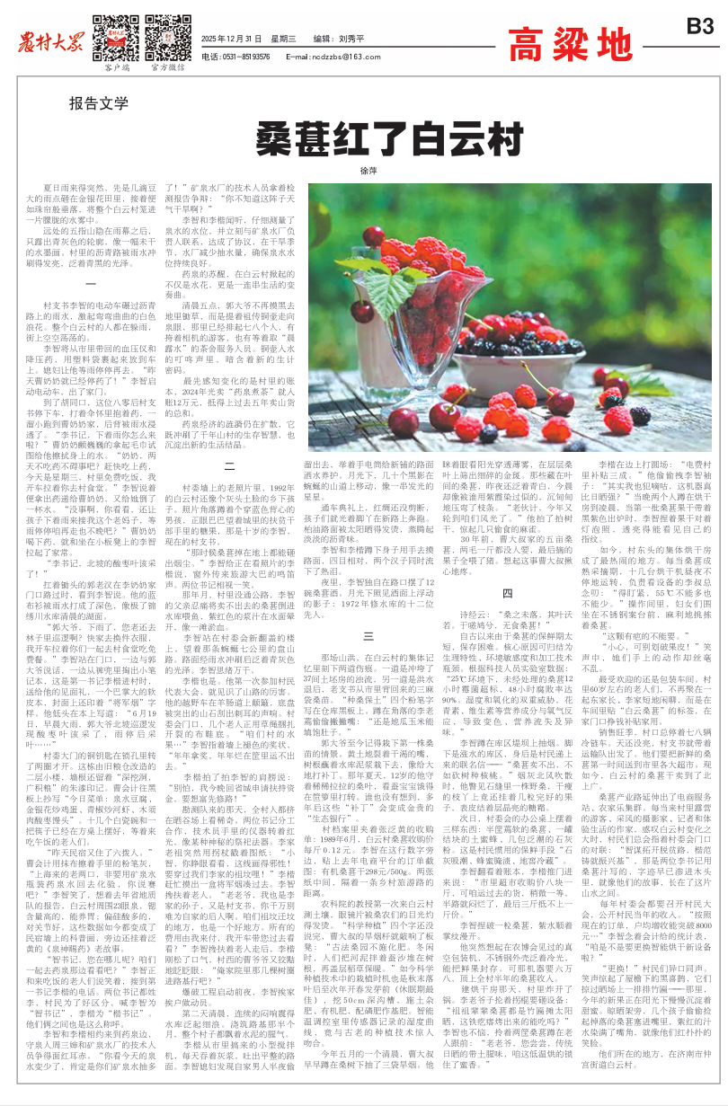 桑葚产业路延伸出了电商服务站、农家乐集群。每当来村里露营的游客、采风的摄影家、记者和体验生活的作家,感叹白云村变化之大时,村民们总会指着村委会门口的对联:“智谋拓开脱贫路,楷范铸就振兴基”,那是两位李书记用桑葚汁写的,字迹早已渗进木头里,就像他们的故事,长在了这片山水之间。