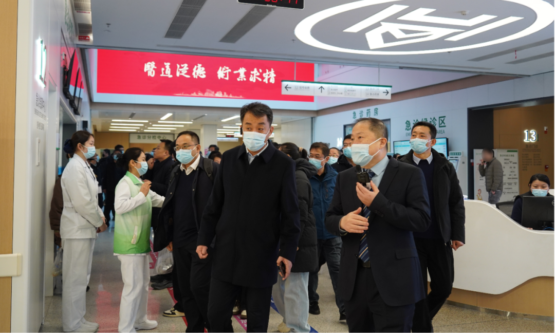 调研首站来到急诊医学中心。李建军重点介绍了医院在急危重症救治中体现的 “速度与温度”。通过实现与120急救车实时联动、优化就诊流程、设置绿色通道、推行一站式服务等举措,提升了急救效率与患者就医体验,真正践行了 “以患者为中心” 的服务宗旨。