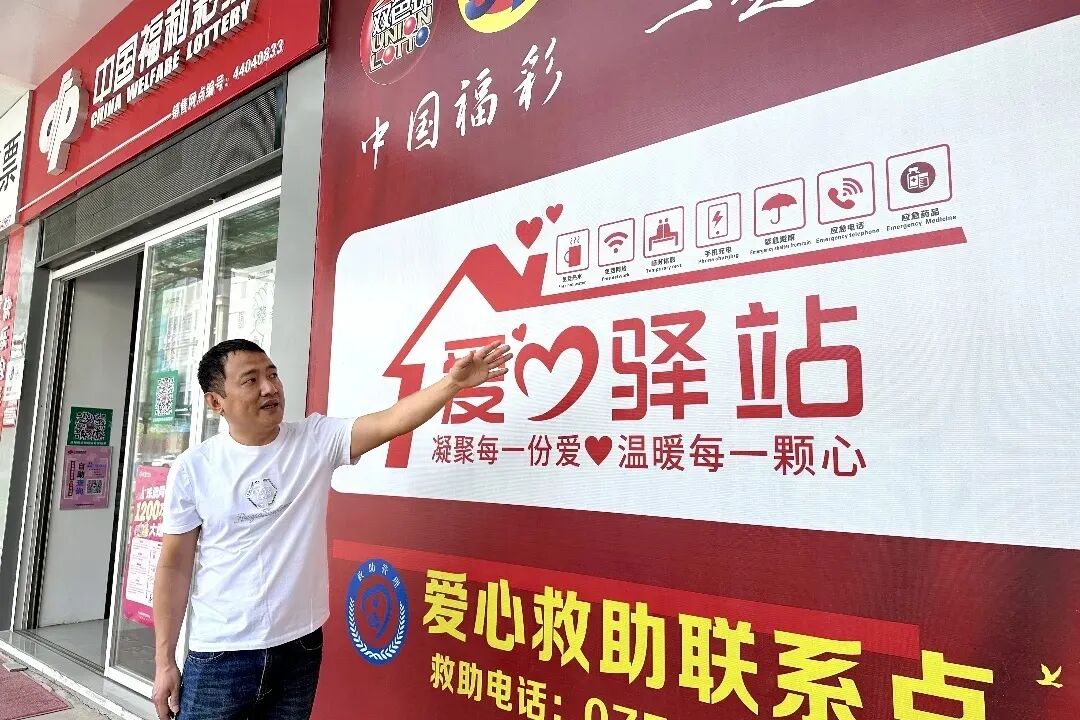 在龙湖区新溪街道,谢灿伟的福彩代销点便是爱心救助联系点之一。不过,谢灿伟代销点扮演的角色,远不止于此。去年,谢灿伟在站点外墙上,立起了一块足有一层楼高的宣传牌,上面清晰印有“爱心驿站”几个大字,旁边还列着免费热水、免费网络、临时休息、手机充电、紧急避雨等一系列标识。