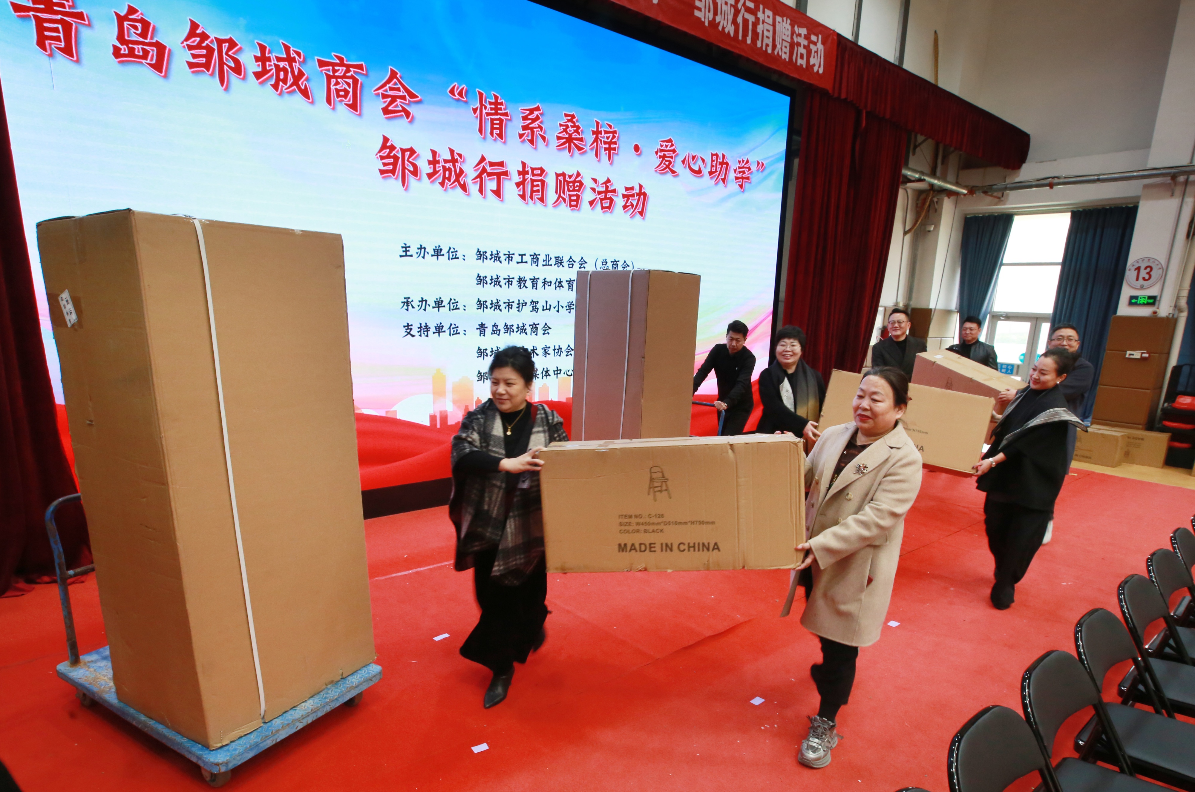 12月28日至30日,10多位在青岛创业的企业家代表青岛邹城商会,开启家乡之行。商会一行首先前往护驾山小学,举办“情系桑梓·爱心助学”捐赠活动,向护驾山小学捐赠100把折叠座椅和2台大功能电饮水机,支持学校提升设施水平,为学生创造更好的学习条件。