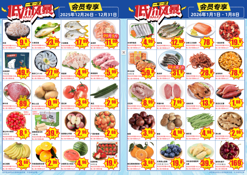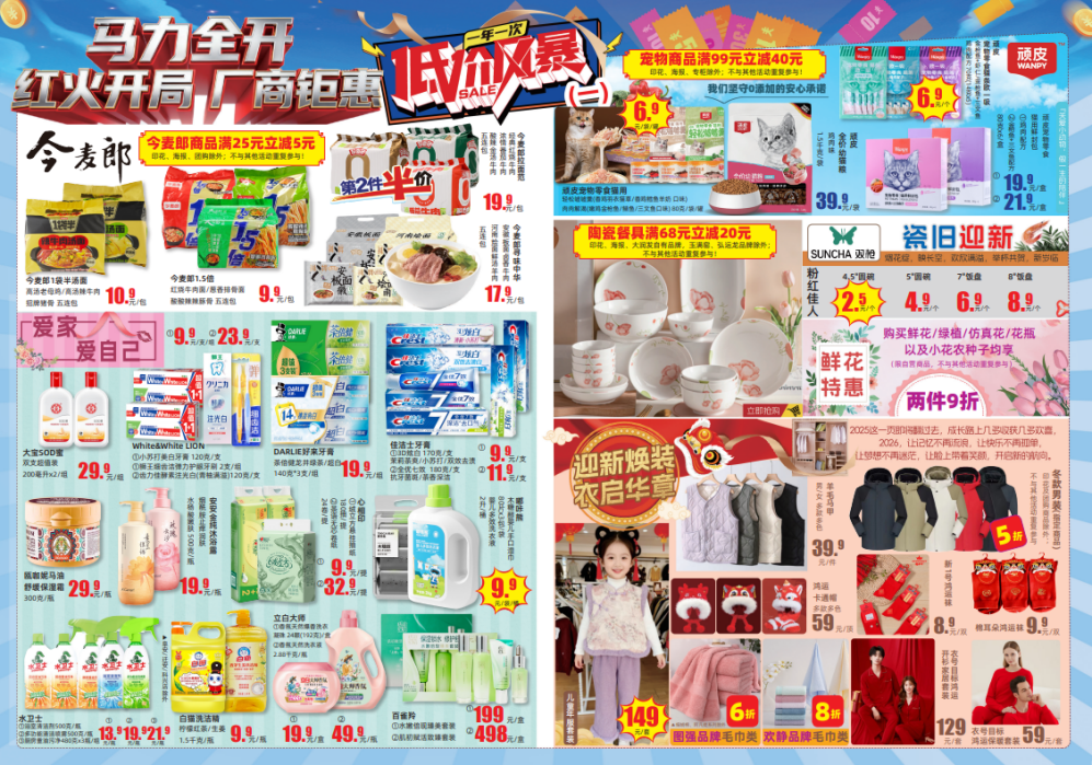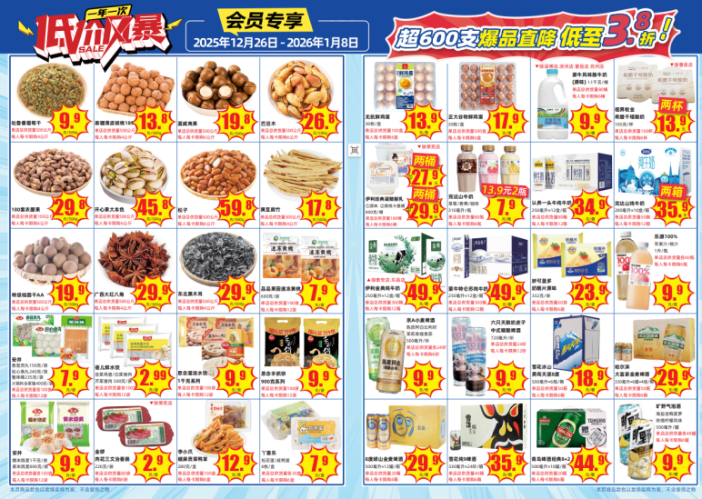 随着元旦将至,新春临近,年味渐浓,大润发启动了一年一次的“低价风暴”大规模年节促销活动,本次促销横跨元旦,推出“低价风暴爆品直降热潮”与“会员回馈”双线并行的重磅优惠,覆盖生鲜、零食、粮油、家居等全品类商品,让消费者到店就能体验实惠与年味兼具的年节采购预热场。