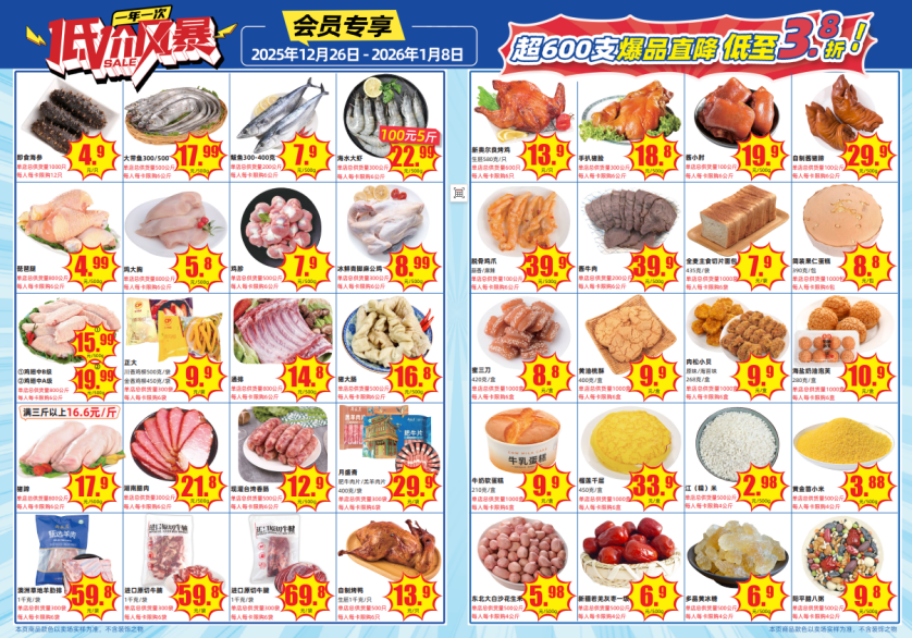 据大润发相关负责人介绍,本次“低价风暴(一)”活动精选超600款高频消费品类,推出直降优惠,最低折扣达3.8折。其中生鲜区是最大亮点: