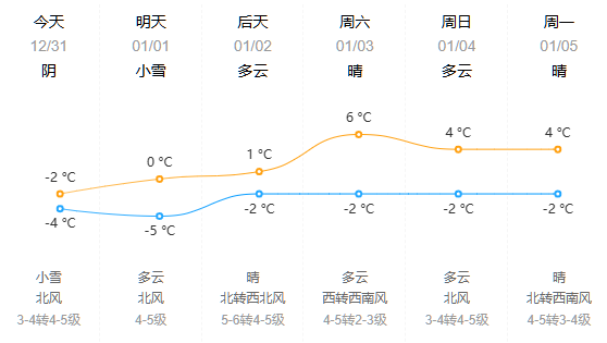 今夜到明天,阴有小到中雪,北风5~6级阵风7级明天下午逐渐增强到6~7级阵风8级,-4℃~0℃;