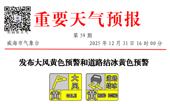 威海市气象台2025年12月31日16时00分发布大风黄色预警和道路结冰黄色预警: