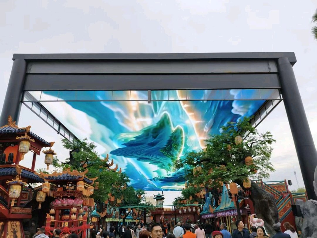在济南济阳黄河风景区的“九曲黄河万里情”主题街区,由浪潮智能终端打造的山东省内规模最大,总面积达1581平方米的巨幅LED天幕缓缓亮起,宛如悬于夜空中的数字画卷。白天,天幕通过播放黄河流域四季风光影像,营造“人在画中游”的视觉沉浸感;入夜,切换为浩瀚星河或讲述济阳非遗文化的动态故事,与地面灯光、音乐喷泉联动,营造出“漫步星河伴黄河”的梦幻场景。