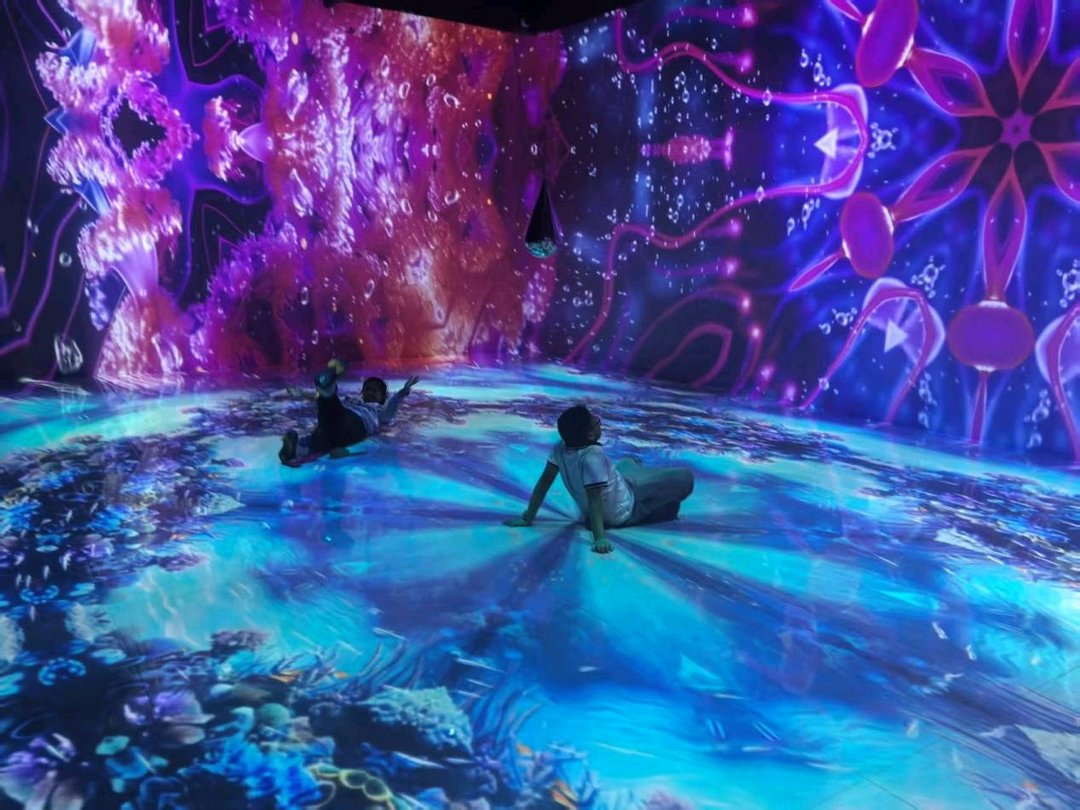 新开业的长春万达茂商业综合体,一场名为“无限之海-沉浸式AI艺术展”的数字海洋奇旅正在吸引着众多市民与游客。巨幅屏幕上,不断变幻的海洋景象缓缓流动,斑斓的鱼群自由游弋,孩子们兴奋地伸出手,试图触摸近在眼前的虚拟水母。