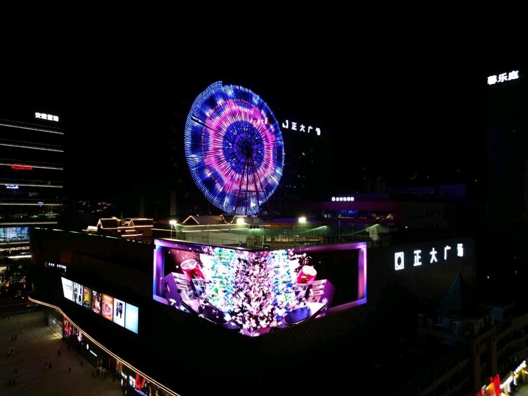 点亮“一点位”,带火“一商圈”。在合肥正大广场,行人常被巨大的户外双屏联动裸眼3D天幕所吸引。浪潮智能终端助力打造显示面积达4000平方米的户外大屏,通过90°无缝转角设计,与远处摩天轮形成巧妙呼应,光影互动的全新体验为现代商业中心空间转型、激活消费“新夜态”提供了路径。
