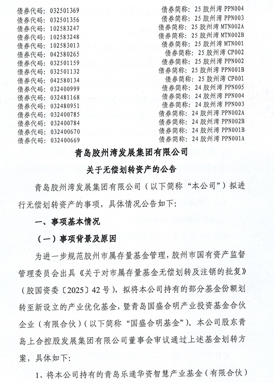 青岛胶州湾发展集团表示,本次资产无偿划转事项对公司财务状况无重大影响,对日常生产经营及偿债能力无实质影响,不会影响公司存续债券的本息兑付。