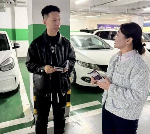 在一处地下停车场,光大银行滨州分行工作人员拿着反诈宣传折页,与车主面对面交流。停车场里车辆有序停放,工作人员提醒切勿点击不明链接、下载非官方APP,不向陌生人透露银行卡密码、验证码等敏感信息,结合真实案例拆解骗局逻辑,提醒车主保护好个人信息,接到可疑来电及时核实,把反诈意识植入到日常出行场景中。