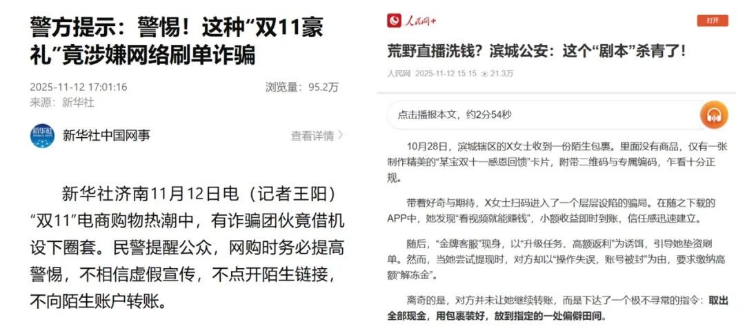 11月12日,“滨州公安”同时登上了新华社、人民网平台。随着电信诈骗手段不断翻新,公安机关根据案件侦办情况及时向社会拆解新型诈骗套路。在滨州公安侦破的一起案件中,骗子指挥受害人线下放置现金,并提前安装摄像头远程监控。因破案迅速、资料完整,新华网社、人民网同时对案件侦办过程进行报道,披露诈骗手法,提升广大群众识骗、防骗意识。