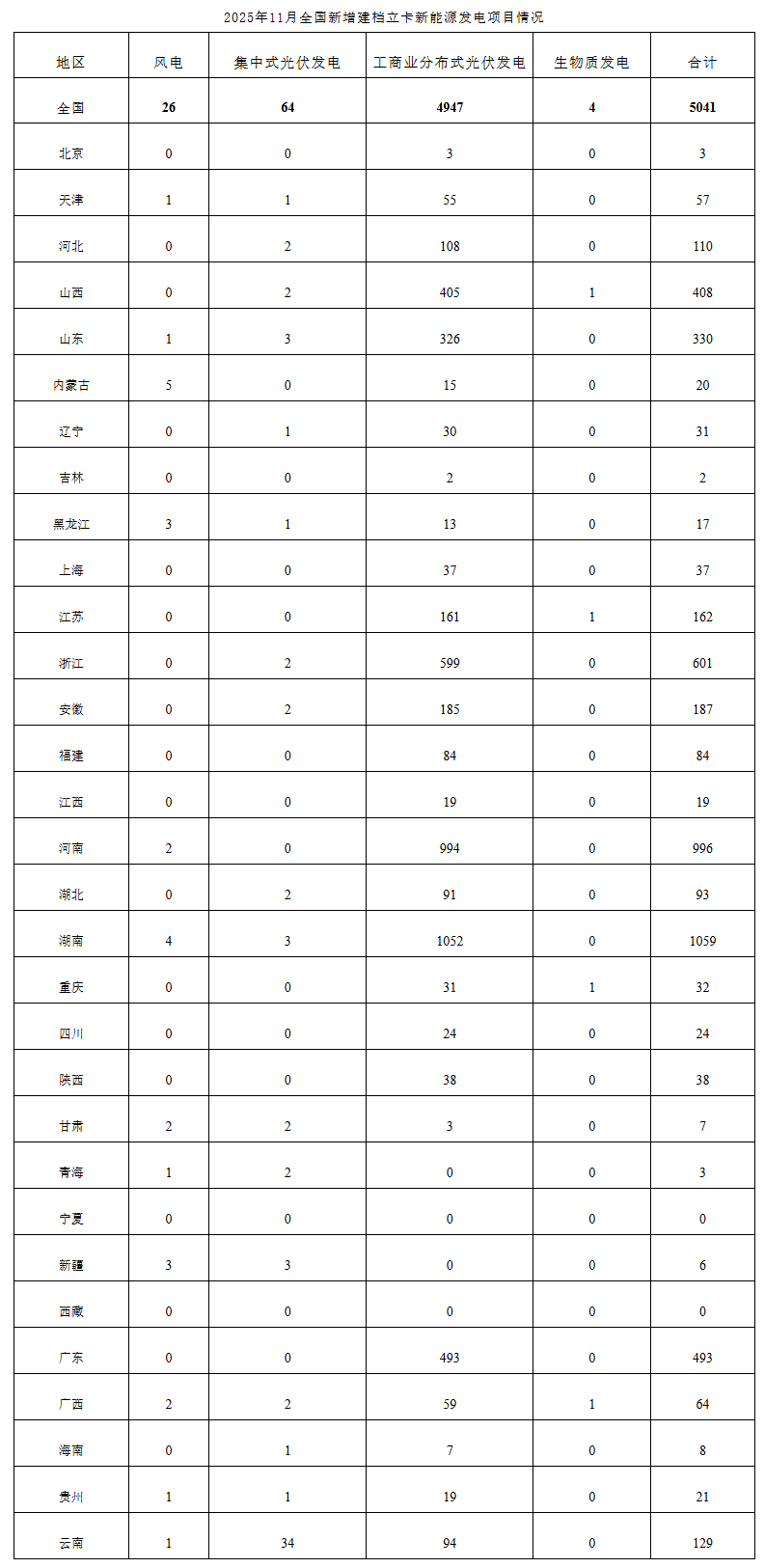 2025年12月31日,国家能源局公布全国新增建档立卡的新能源发电项目数据:2025年11月,全国新增建档立卡新能源发电(不含户用光伏)项目共5041个,其中风电项目26个,光伏发电项目5011个(集中式光伏发电项目64个,工商业分布式光伏发电项目4947个),生物质发电项目4个。风电、集中式光伏发电、生物质发电项目清单见附件,工商业分布式光伏发电项目清单详见国家可再生能源发电项目信息管理平台网站(网址https://jdlk.renewable.org.cn/card-info-sheet/)。