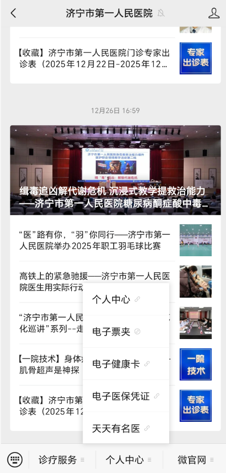 ①在微信搜索“济宁市第一人民医院”公众号,点击“个人中心” ,选择“就诊人” ,选择“门诊预交金退款”。