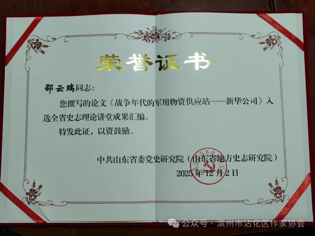 在渤海之滨、枣乡大地,红色血脉奔涌不息。邵云瑞撰写的《战争年代的军用物资供应站——新华公司》一文,以扎实史料与深情笔触,还原新华公司惊心动魄的峥嵘岁月,彰显信仰与担当,现已入选山东省史志理论讲堂成果汇编,为滨州沾化红色文化再添厚重篇章。