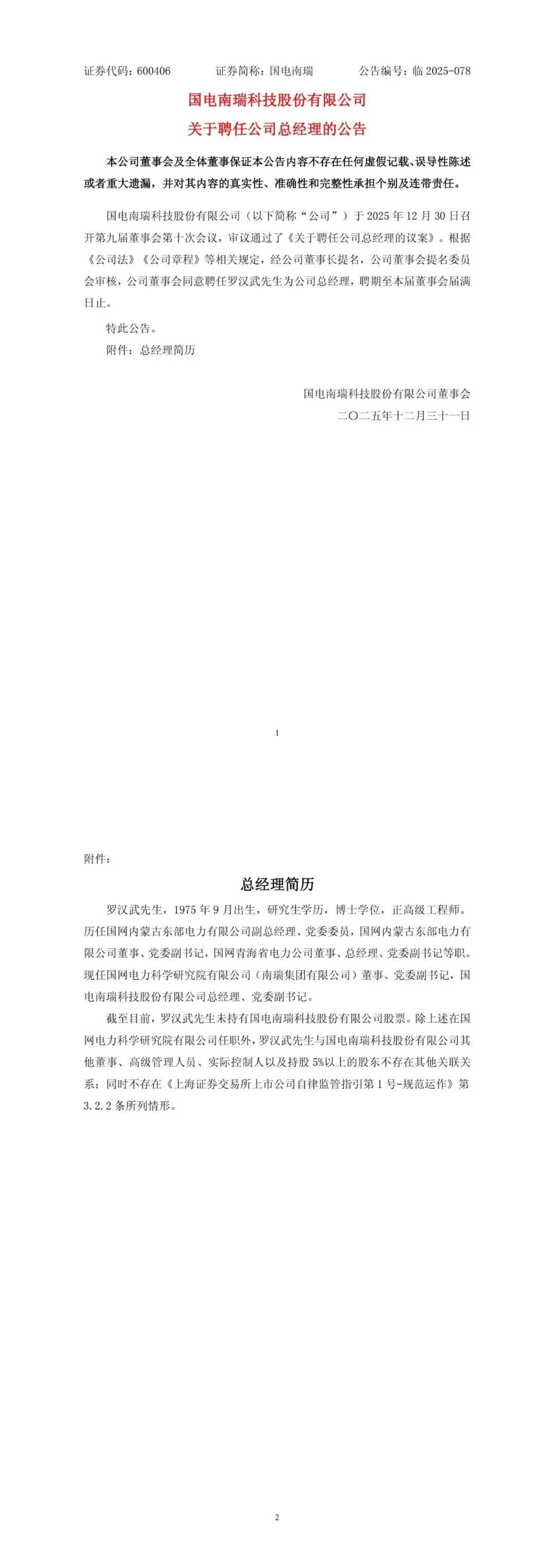 据上海证券交易所消息,国电南瑞科技股份有限公司于2025年12月30日召开第九届董事会第十次会议,审议通过了《关于聘任公司总经理的议案》。根据《公司法》《公司章程》等相关规定,经公司董事长提名,公司董事会提名委员会审核,公司董事会同意聘任罗汉武先生为公司总经理,聘期至本届董事会届满日止。