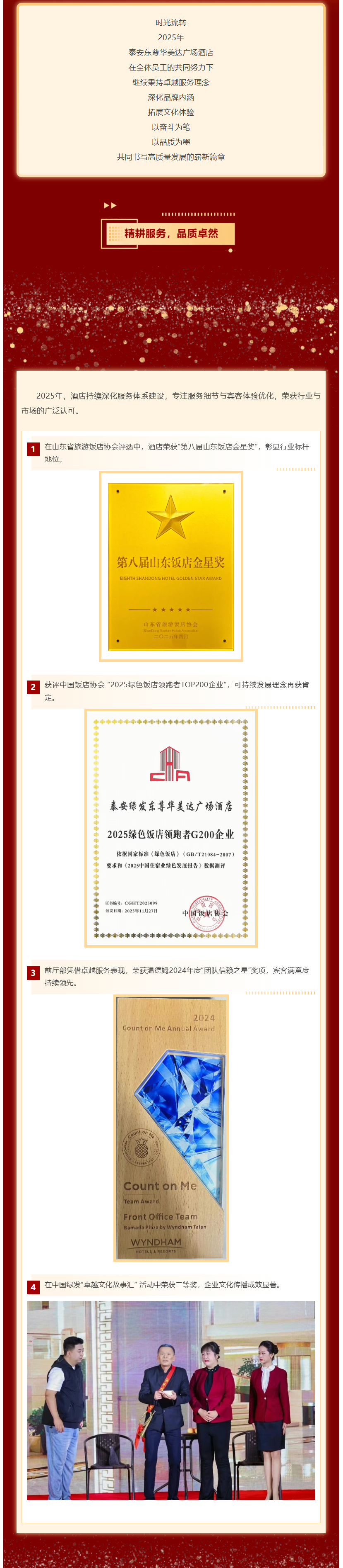 以奋斗为笔,以品质为墨|泰安东尊华美达广场酒店2025年度回顾大众报业·齐鲁壹点 2025-12-31 18:44:17(美丽东尊)(齐鲁晚报·齐鲁壹点客户端欢迎各界投稿,提供线索,包括文字、照片、短视频。泰安新闻素材请联系齐鲁晚报泰安融媒中心,热线电话:0538-6982110。)责任编辑:赵晴