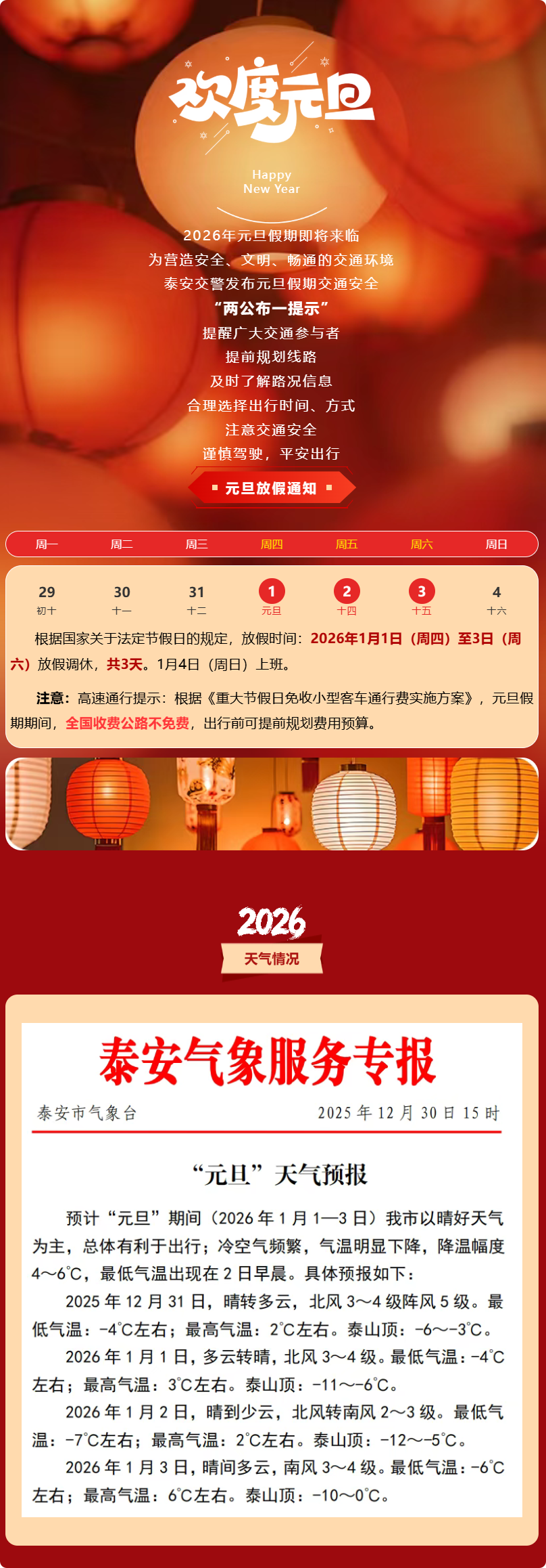 @泰安驾驶员,元旦避堵+防事故指南,速转收藏!大众报业·齐鲁壹点 2025-12-31 18:47:46(泰安交警) (齐鲁晚报·齐鲁壹点客户端欢迎各界投稿,提供线索,包括文字、照片、短视频。泰安新闻素材请联系齐鲁晚报泰安融媒中心,热线电话:0538-6982110。)责任编辑:赵晴