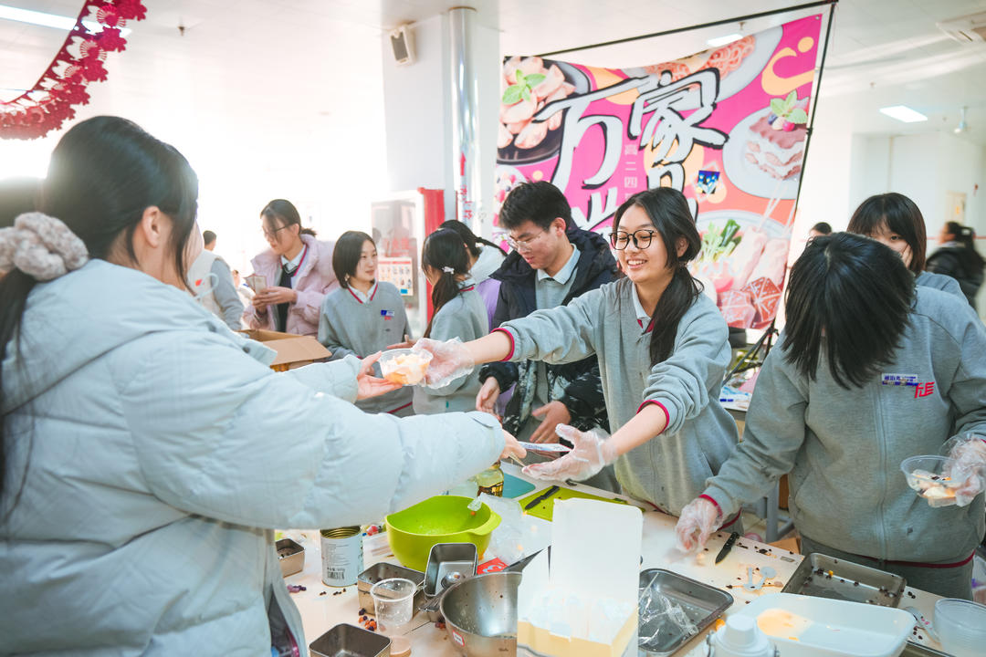 市集尚未正式开启,学生们已化身“实干家”,早早来到场地布置摊位。餐厅一、二层的“舌尖济味铺”里,同学们系着围裙忙碌不停,有的摆放自制美食,有的细心擦拭桌面,还不忘张贴精心设计的宣传海报。“这是我们小组筹备了半个月的成果,从选食材到定价格都亲力亲为,既紧张又期待。”一位负责美食摊位的同学脸上满是兴奋,尽管忙碌得额头冒汗,却始终笑意盈盈。食堂限定工坊的热食香气与学生摊位的特色美味交织,同学们热情地向师生家长推荐菜品,稚嫩的吆喝声里满是成就感。