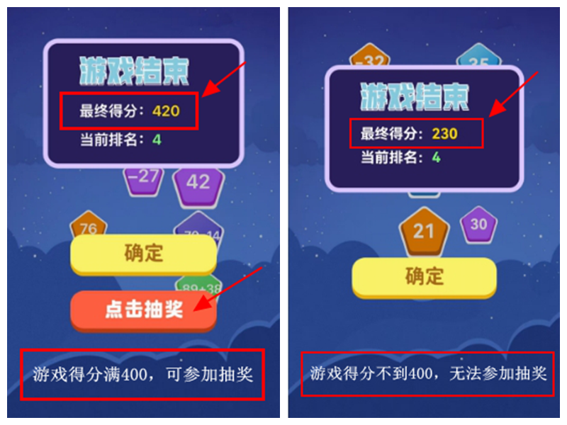 玩“元旦消消乐赢微信红包”快来试试你的手气吧! 点击参与游戏 游戏内容↓↓↓随机生成数字,并按照数字顺序从小到大点击每消除一个数字可获得10积分累计超过400积分,可获得一次抽奖机会 游戏规则↓↓↓每人每天可以参与一次抽奖微信红包随机分配 点击参与游戏