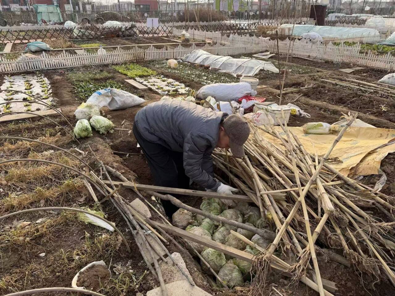 即便当日气温已降至零下,菜园里却仍有忙碌的农耕身影。58岁的王先生正仔细地将自己种的白菜整齐的放入身旁挖好的浅坑中。“这是给白菜保鲜的,埋在土里能存到开春。自己种的菜没农药、没化肥,吃着特别放心。”王先生一边忙活一边介绍。