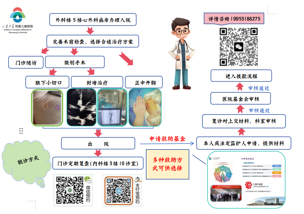 山东大学附属儿童医院(济南市儿童医院)心脏外科医生为家长朋友们细心准备了就诊治疗流程导图。