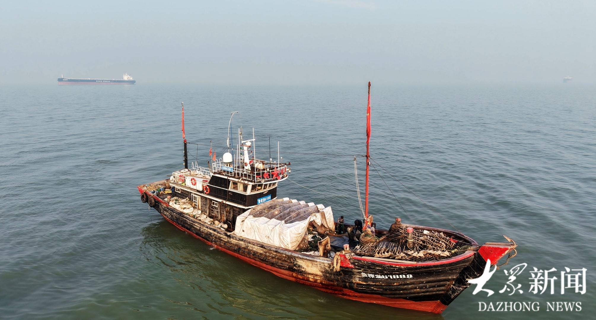 2025年12月29日,滨州市无棣县埕口镇东郭村渔民驾驶渔船,在渤海湾捕捞琵琶虾。