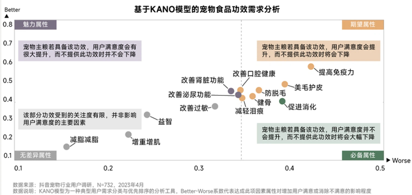 另外,据抖音2023年5月发布的《2023巨量引擎宠物行业白皮书》,基于KANO模型的宠物食品功效需求分析显示,减脂功效受到的关注度有限,并非影响用户满意度的主要因素。