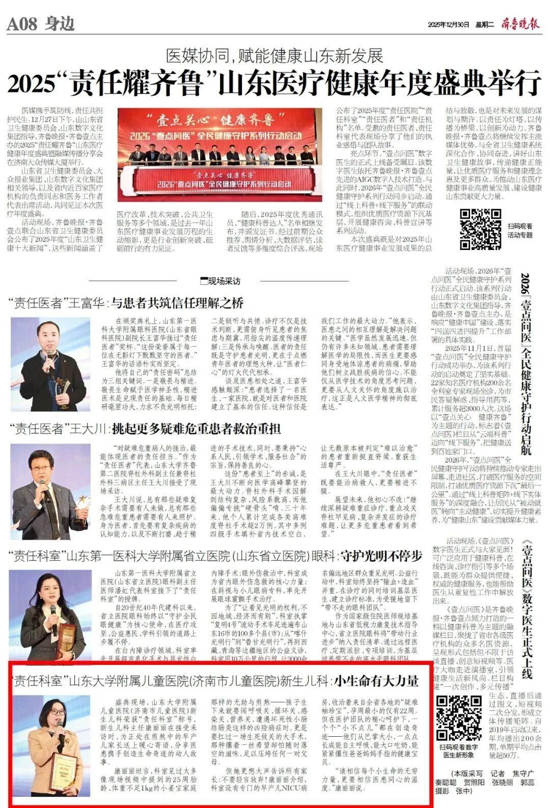 在这场汇聚齐鲁大地医疗精英、共话健康使命的盛会上,山东大学附属儿童医院新生儿科荣耀斩获2025年度“责任科室”殊荣,康丽丽主任代表科室上台领奖并分享救治心得。