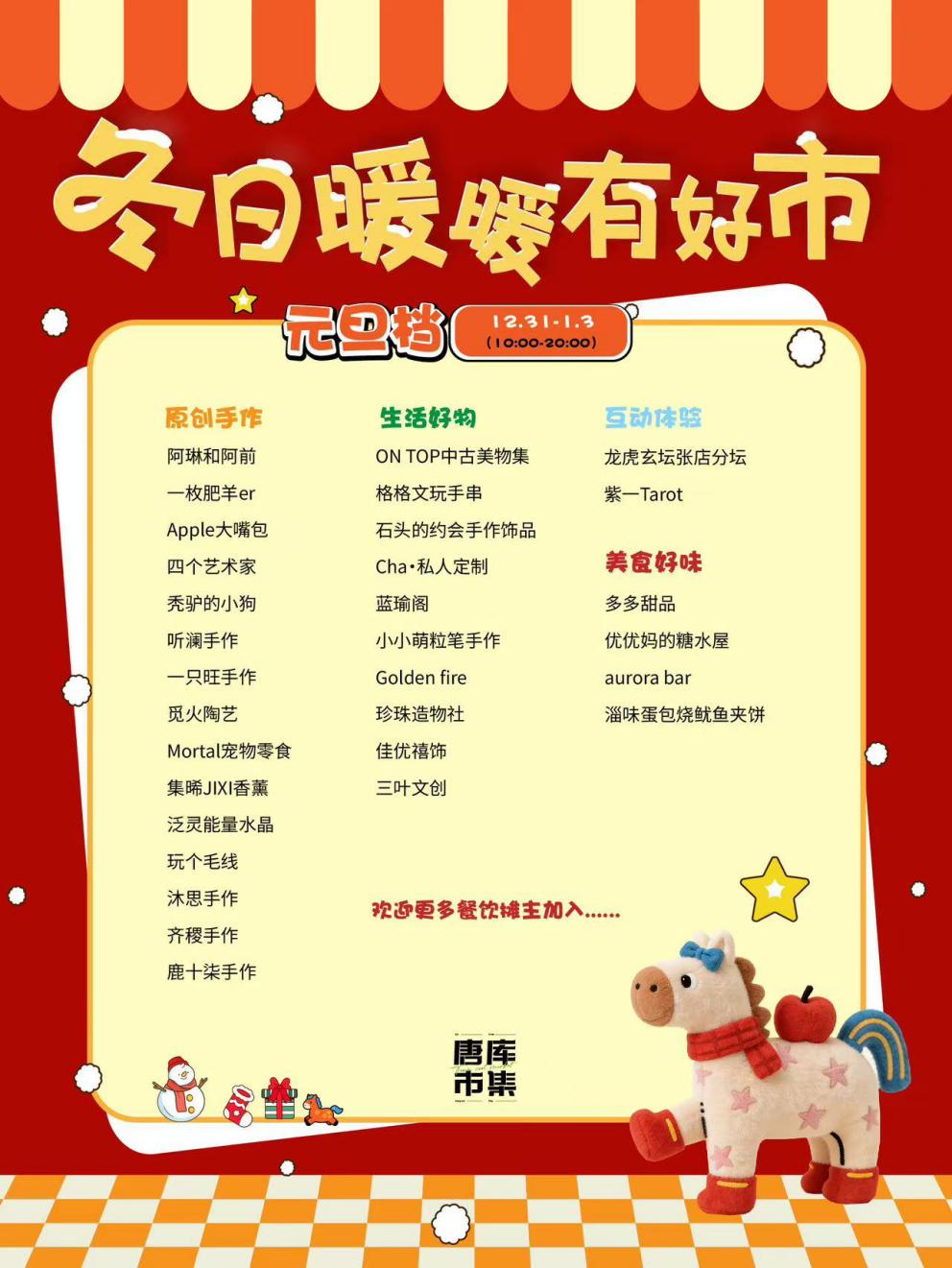 暖冬美食区:手工糖画、面人、热红酒、关东煮、烤红薯、特色小吃、手工馄饨、非遗糕点、新年礼盒、特色茶饮等,集合新春特色美食与热饮,满足市民味蕾需求,营造烟火气氛围。
