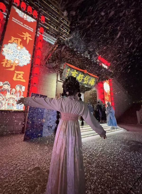 2025年12月31日—2026年1月3日,海岱楼钟书阁的“海岱好市”变身古风“山海雪市”,市集融合冬季雪景与上古山海经元素,打造出一座游玩、互动于一体的奇幻雪中秘境。通过“玩游戏,赚银票”的趣味机制,游客可通过参与各类小游戏获得仿古“银票”,凭票兑换特色礼品或体验项目。市集还有“心动NPC天团”惊艳互动,跨年夜更有DJ嗨翻全场。海岱楼东门每天18:30至20:00有4场人工降雪,快带上你的浪漫“搭子”来海岱楼遇见“山海雪市”吧。