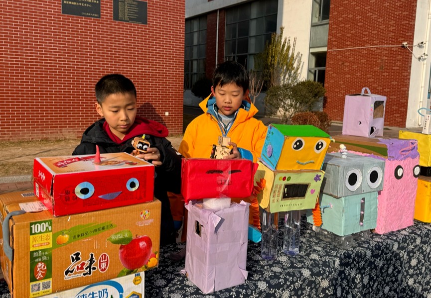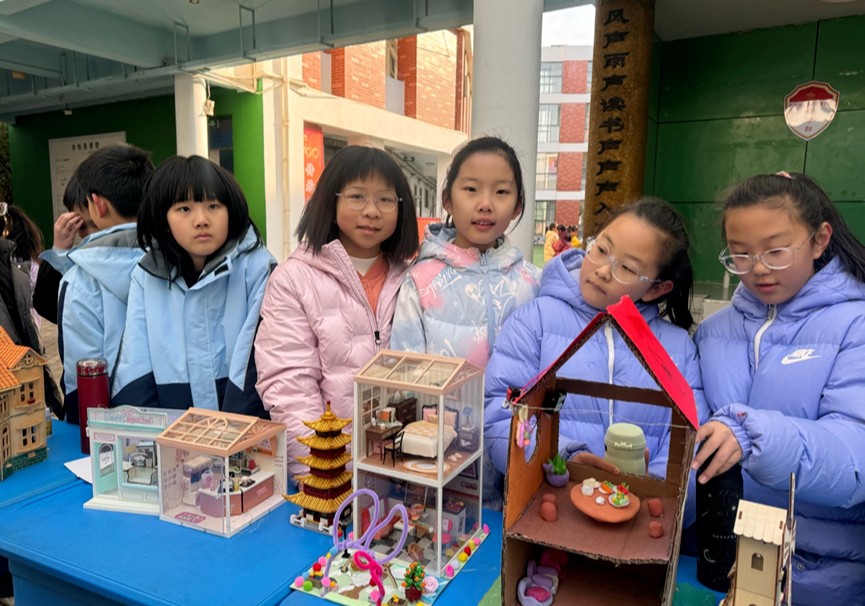 三年级展台上则摆放着各类可移动交通工具模型。四年级以“我的智能小屋”为核心主题,学生将融合建筑知识、节能理念与简易智能技术,利用纸箱、易拉罐等废旧材料,亲手设计制作兼具南北建筑特色、节能功能与智能创意的小屋模型。五年级则以“创·我的AI朋友”为主题,用废旧材料制作AI机器人,践行环保理念,锻炼动手实践与空间建构能力,让创意在指尖绽放。