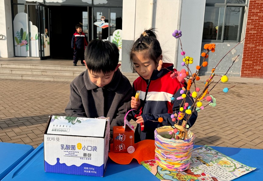 而充满童趣的树叶拼贴画则尽情挥洒着想象力。二年级的“节能小科技”区域,太阳能迷你风扇在冬日的阳光下缓缓转动。