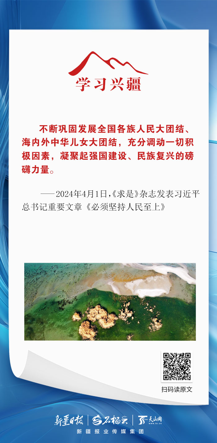 不断巩固发展全国各族人民大团结、海内外中华儿女大团结,充分调动一切积极因素,凝聚起强国建设、民族复兴的磅礴力量。——2024年4月1日,《求是》杂志发表习近平总书记重要文章《必须坚持人民至上》