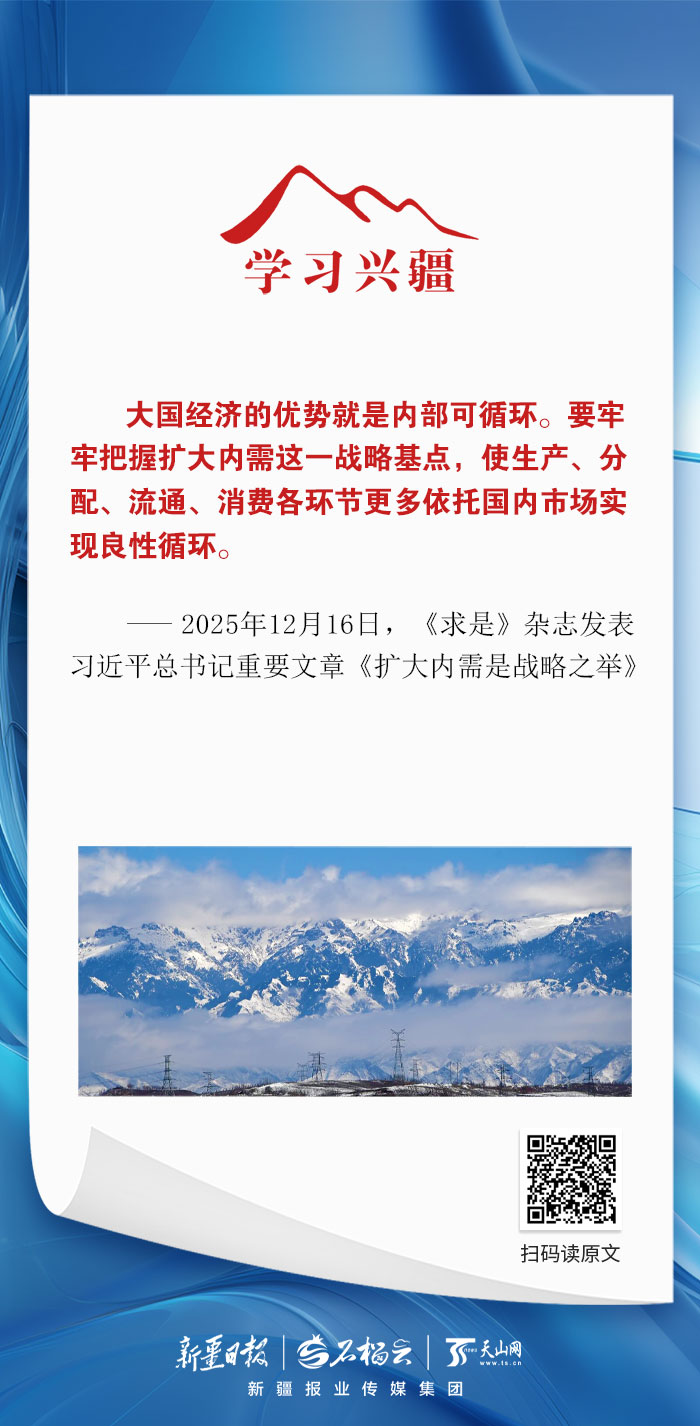 大国经济的优势就是内部可循环。要牢牢把握扩大内需这一战略基点,使生产、分配、流通、消费各环节更多依托国内市场实现良性循环。——2025年12月16日,《求是》杂志发表习近平总书记重要文章《扩大内需是战略之举》