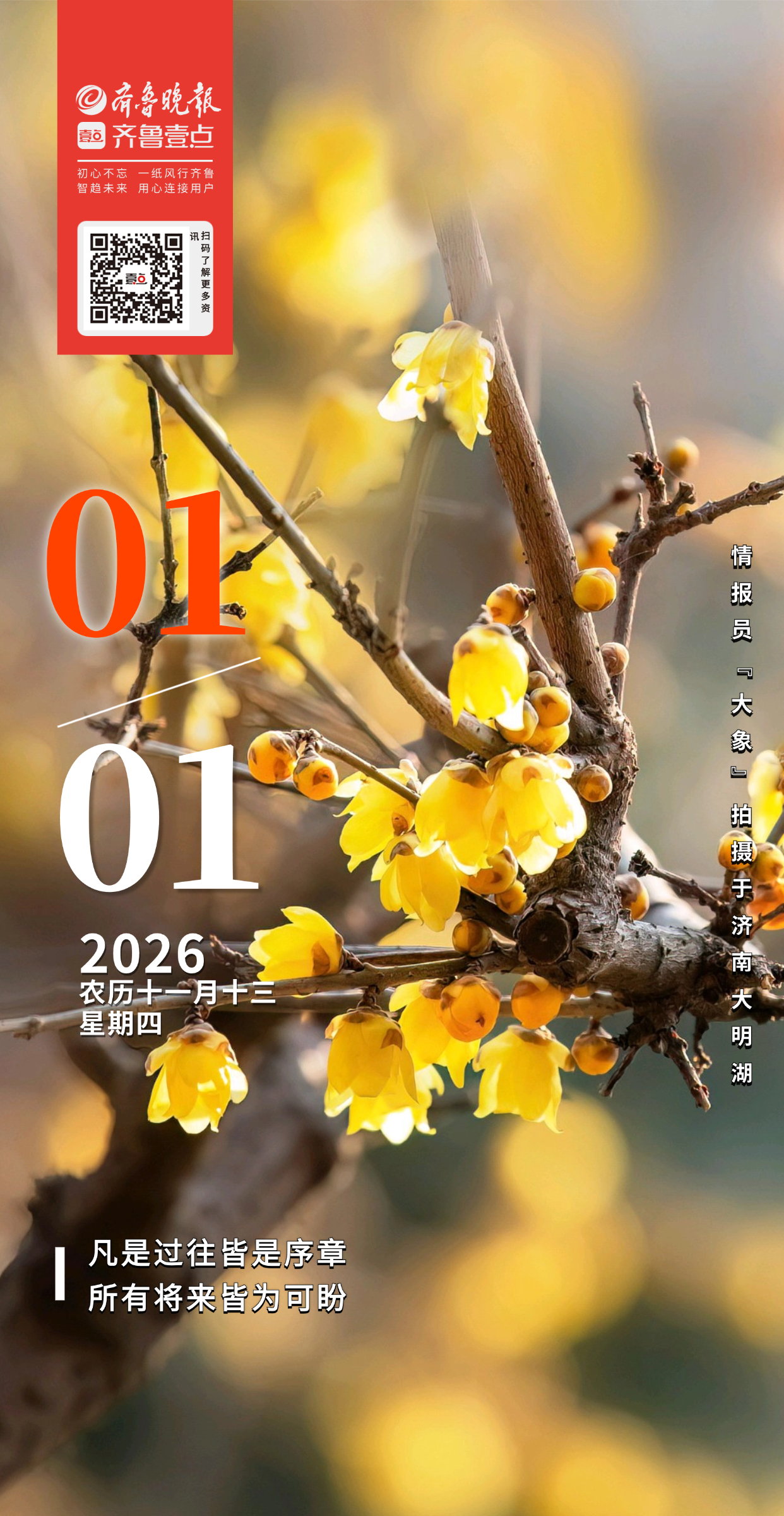 清晨,大明湖畔,蜡梅迎着晨光悄然盛放。金黄花瓣缀于遒劲枝丫,如撒碎金,在蓝天古亭映衬下灵动非凡。微风拂过,暗香悠悠飘散,清冽温柔。枝头花苞半含,攒着一冬期许,将冬日诗意揉进湖光亭影里。