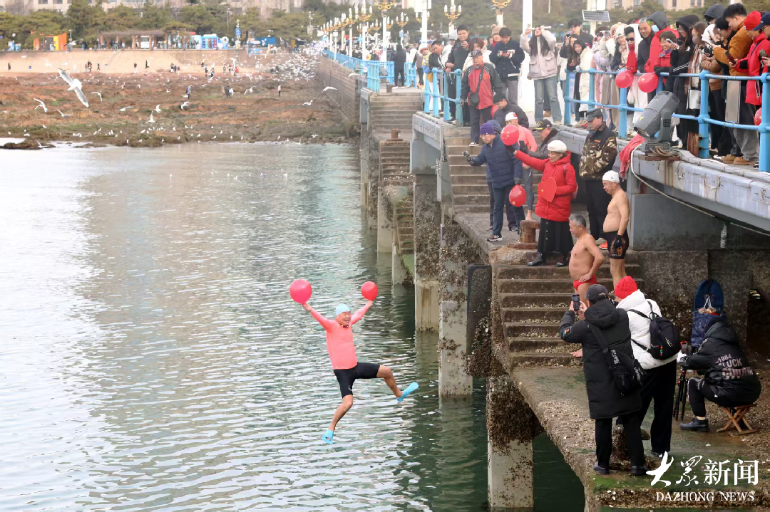 热闹的不止是跳水现场,栈桥沿岸处处洋溢着新年的活力,不少游客忙着投喂海鸥、合影留念,人与美景相映成趣,勾勒出一幅鲜活的海滨迎新图。
