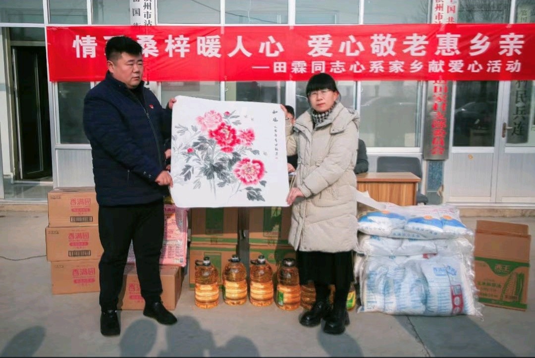冬意渐浓,温情暖村。2025年12月30日,滨州市沾化区富国街道田家村“情系桑梓暖人心 爱心敬老惠乡亲”捐献活动现场暖意融融。创业青年田霖为家乡80岁以上老人捐赠价值万余元的生活物资,而田家村“文艺村长”、省美协会员田敏代表村委会赠送的一幅亲笔创作国画,成为活动中传递文明新风的亮眼一笔,彰显了文艺村长扎根基层、履职尽责的公益担当。