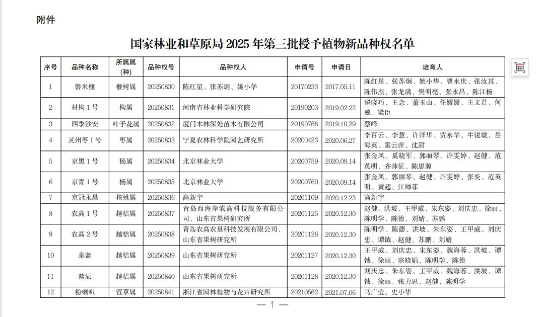 按照《植物新品种保护条例》规定,授权后品种权保护期可达25年。目前,这些新品种已引种至河南、河北、安徽等省扩大试验,未来有望成为我国黄淮海至江淮地区用材林与生态林建设的主力品种。