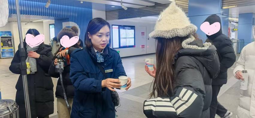 石老人浴场站工作人员为乘客递上姜茶