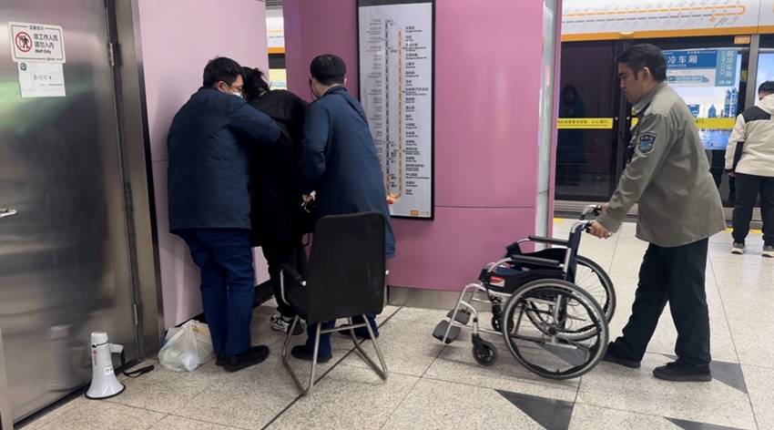 台东站工作人员搀扶脚踝扭伤女乘客